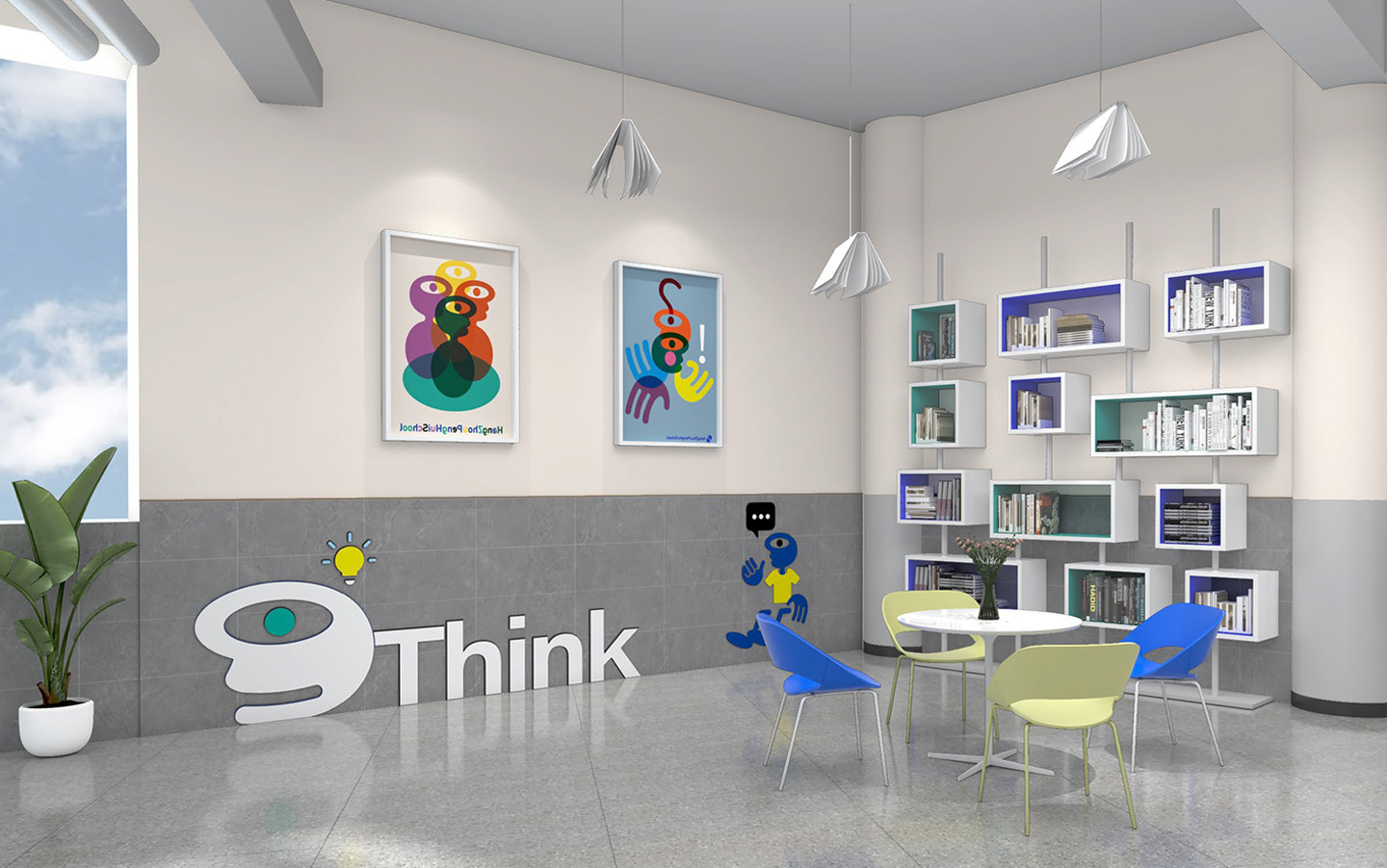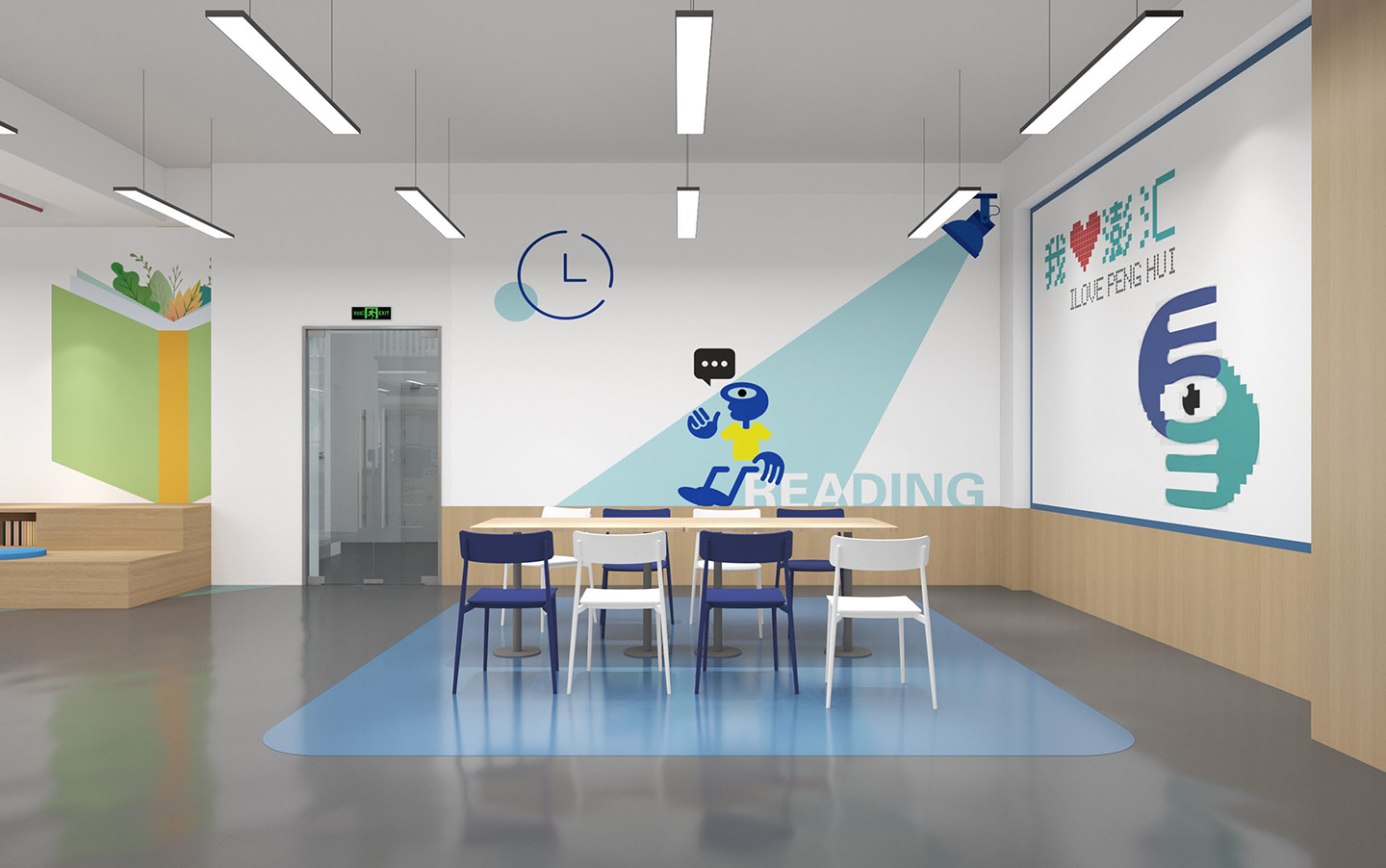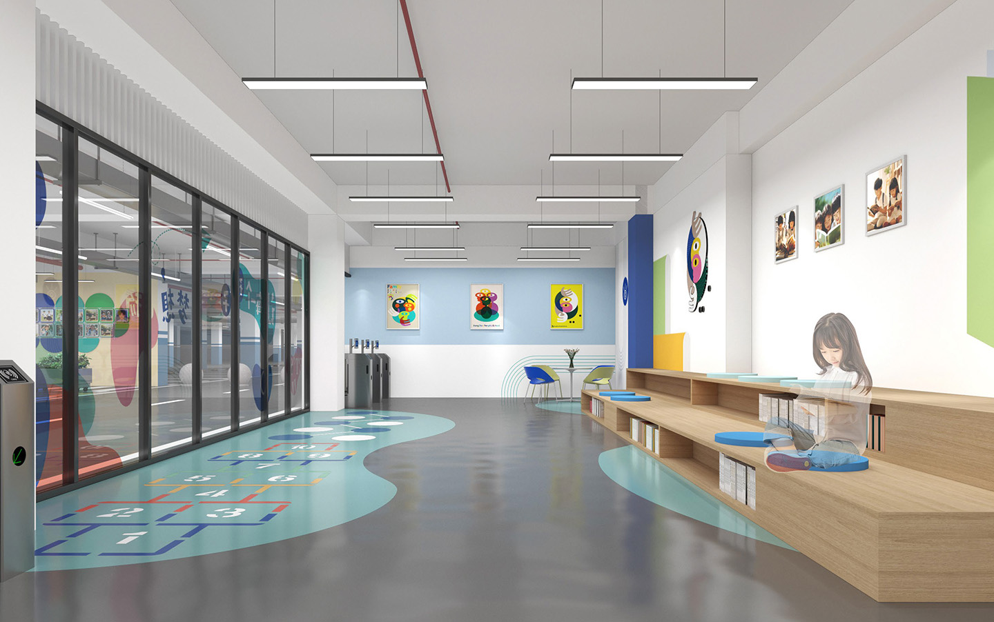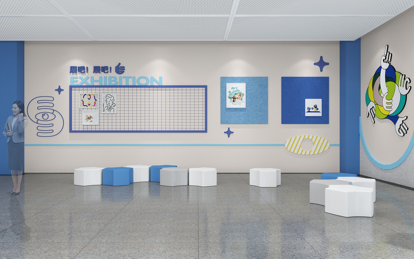 学生等候区。墙面以展示学生作品及风采为主,创设延时等候区,便于个别学生等候家长时可进行阅读、互动小游戏等活动。
