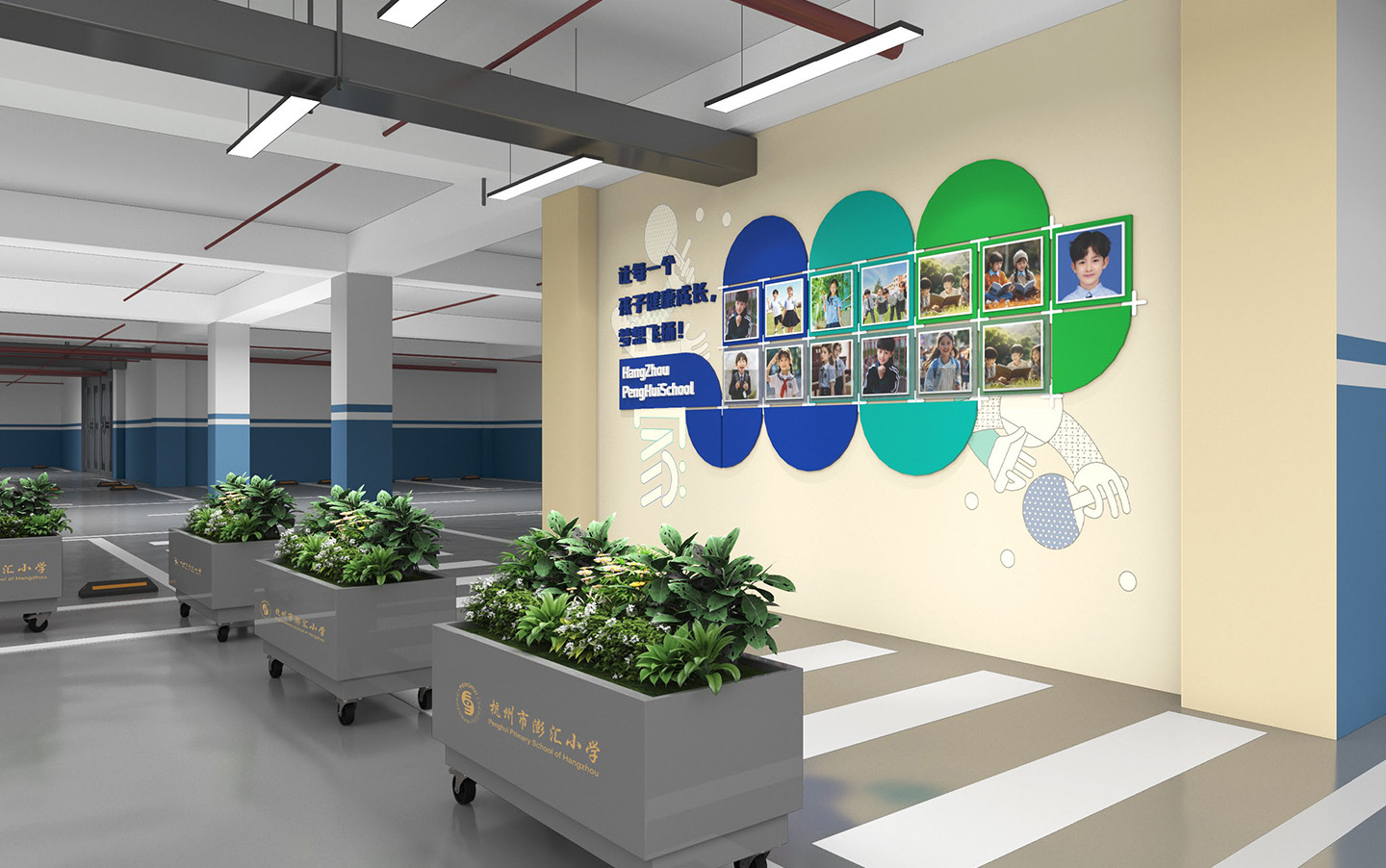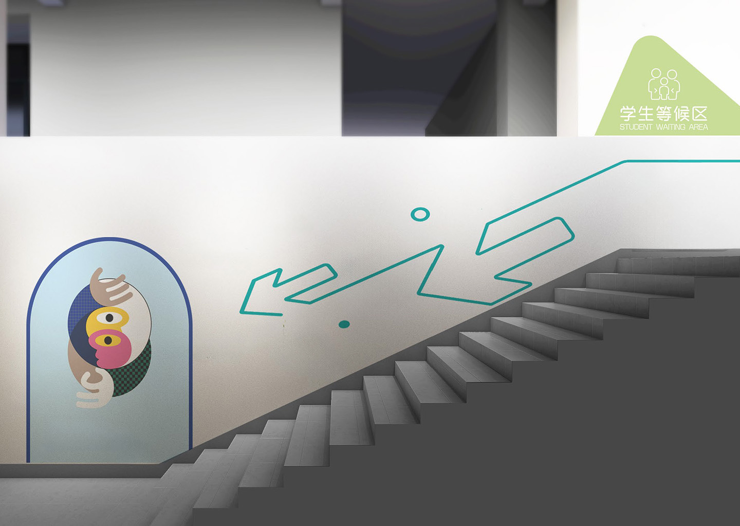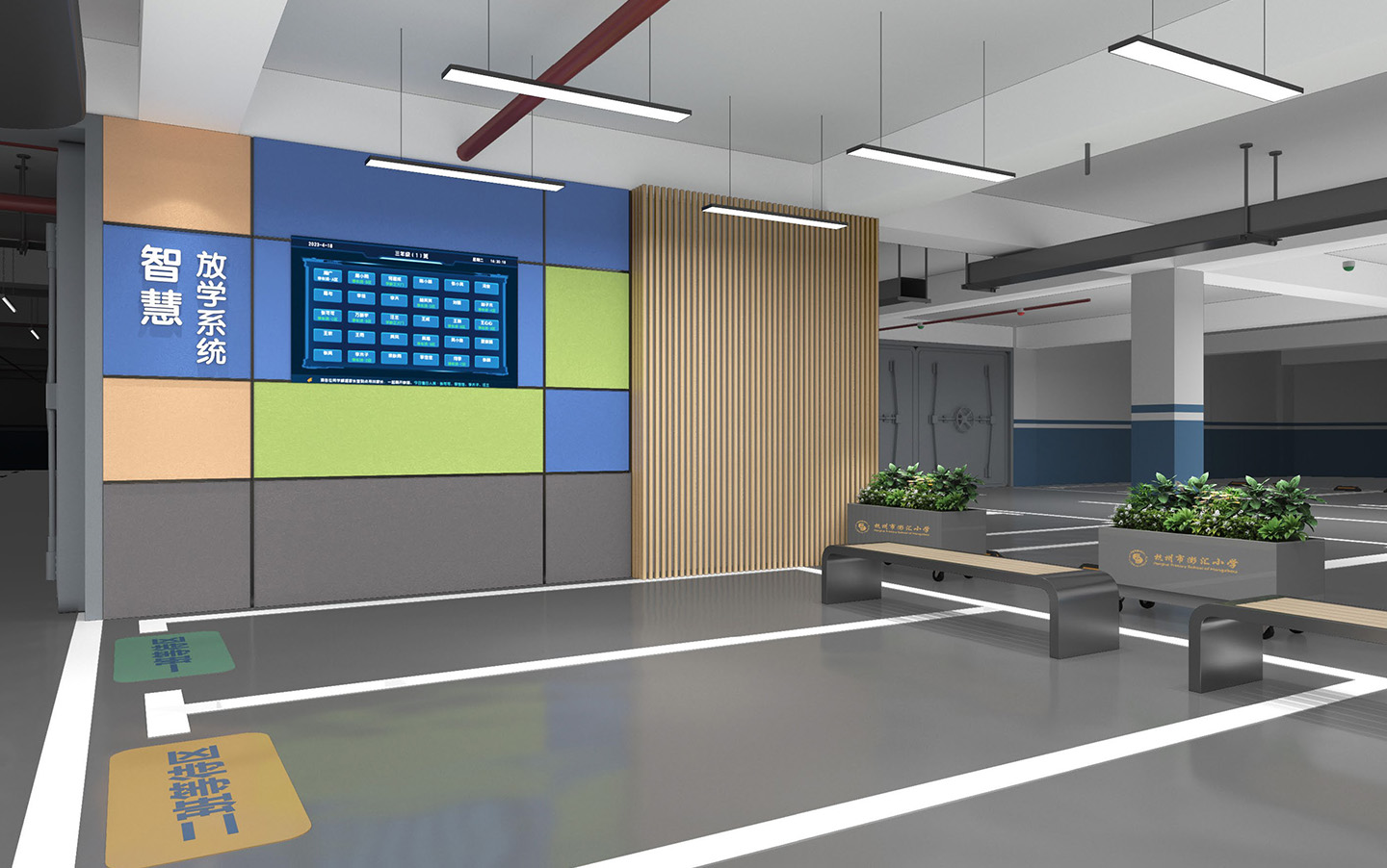 地下车库接送区共分为三个主要分区,即“学生等候区、家长等候区、学生接送区”。嘉尧设计分别用色彩进行区分;同时配备班级放学情况一体机,分别满足家长接送学生以及打造健康接送的文化功能需求。