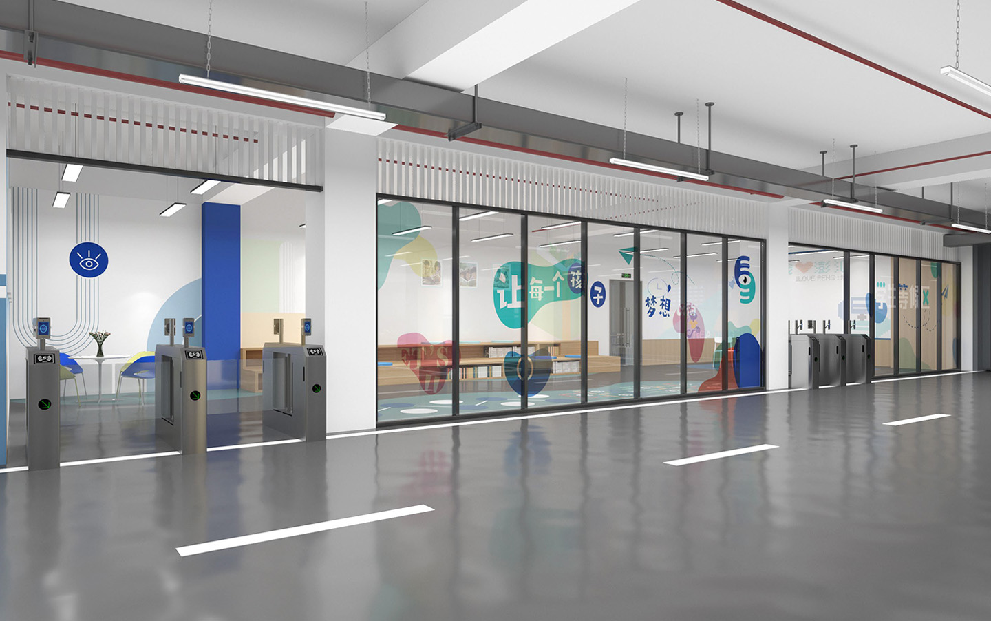 学生接送区。该区域位于家长等候区与学生等候区之间,便于学生更加依次有序地通过闸机并进入校园,规划相关指引,引导安全有序快速通行。