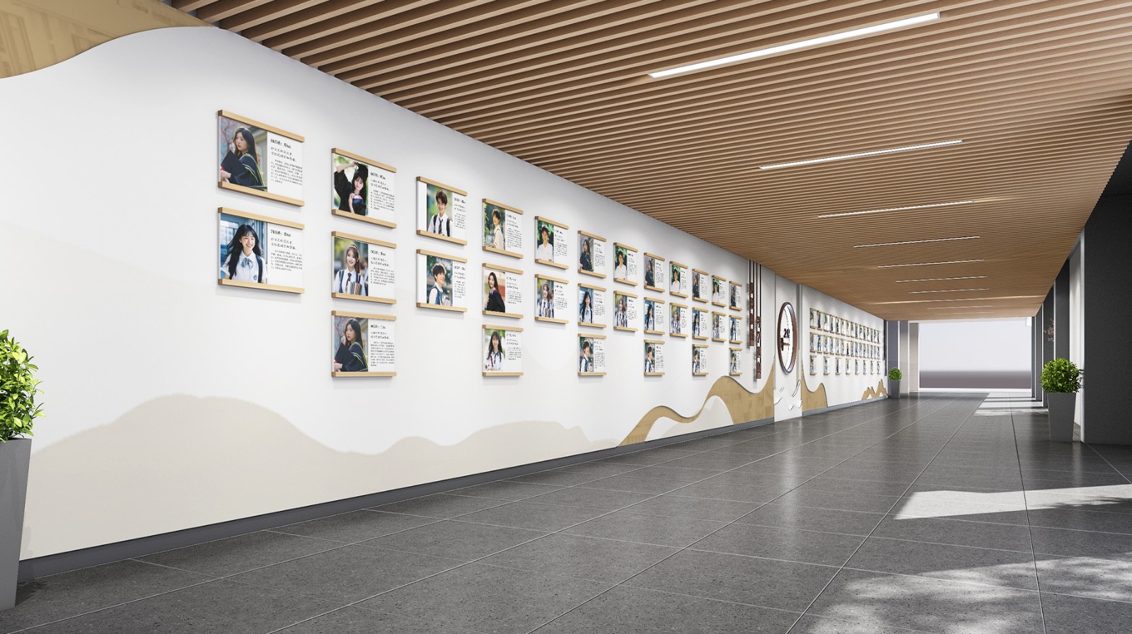 文化长廊需围绕学校的历史、价值观和特色展开设计,通过分区展示(如历史区、荣誉区、艺术区等)增强内容的层次感与记忆点。其核心目标包括传承学校文化,增强师生归属感,提升审美情趣与文化素养,培养爱国情怀,打造互动空间,促进师生交流。和润长廊作为学校主动线,由一条文化连廊贯穿各教学楼,由“启慧”“闻海”“梦天”三大文化主题构成,分别展示本校与南通学校的教育文化交流、学校师生风采及办学成果等内容。