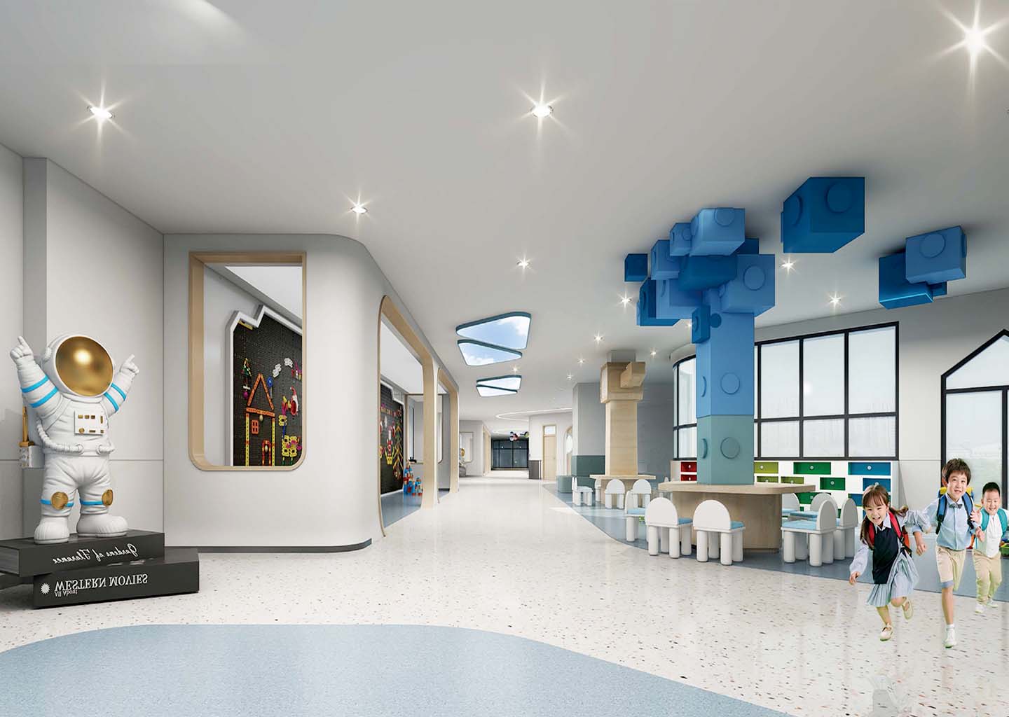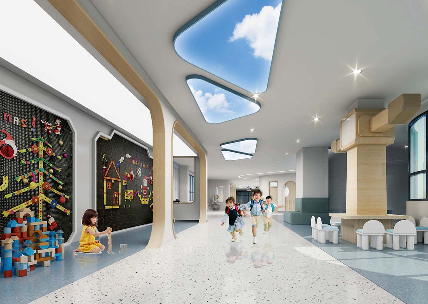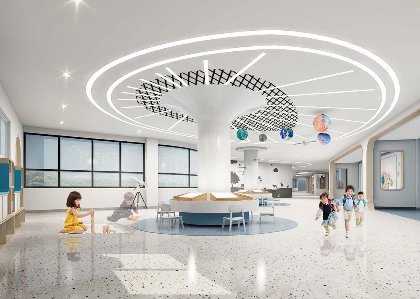 在校园文化设计上,嘉尧设计强调探究趣味、互动体验以及科技感受,将运河幼儿园本身最具亮点的“运河元素”,“光照元素”,“房子元素”融会贯通。结合幼儿教育中循循善诱(运河)、自然向上(光照)、爱的呵护(房子)进行空间营造和功能设计。