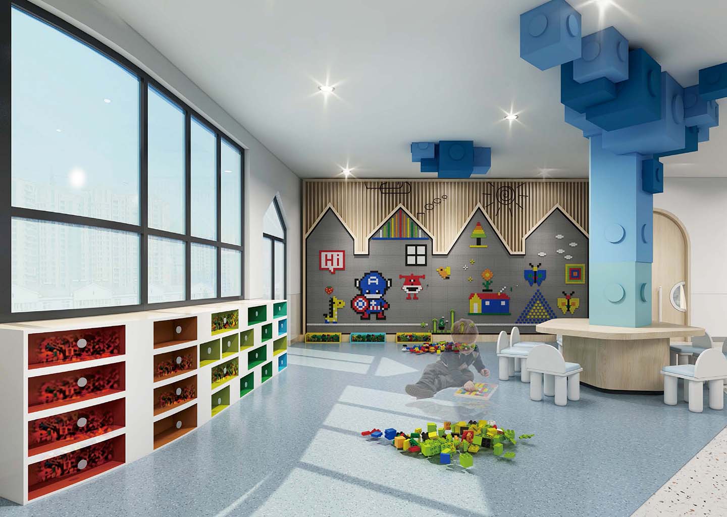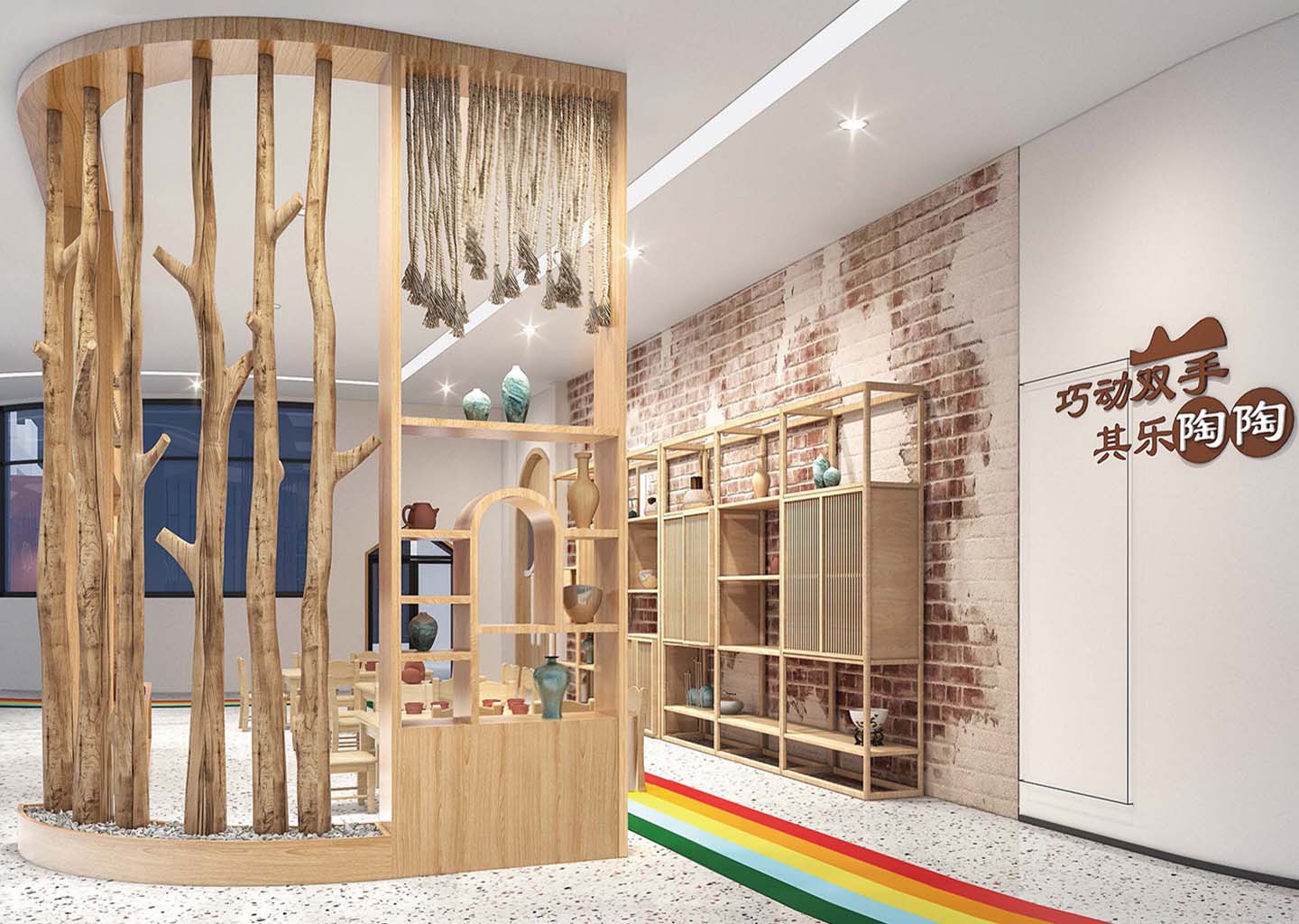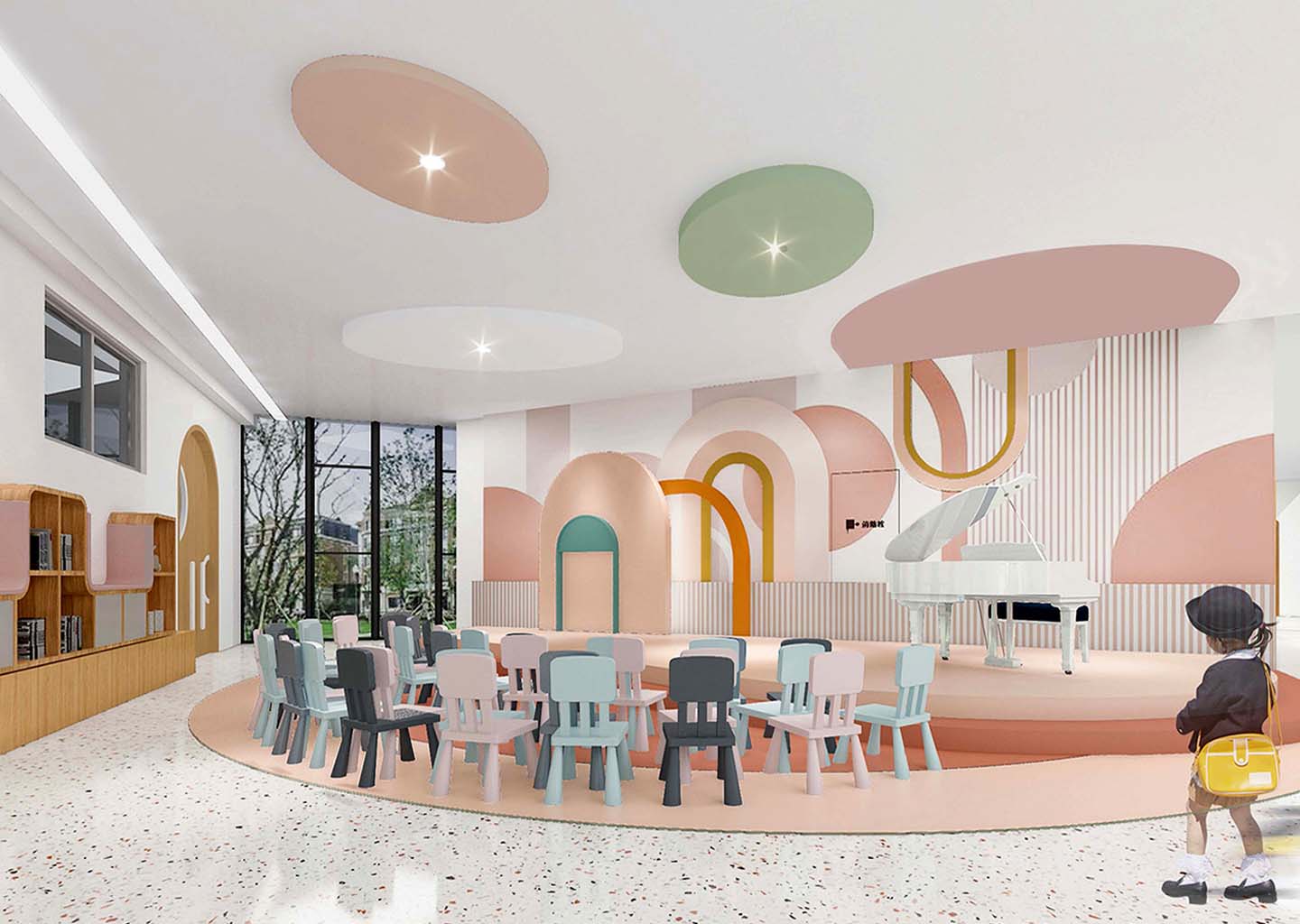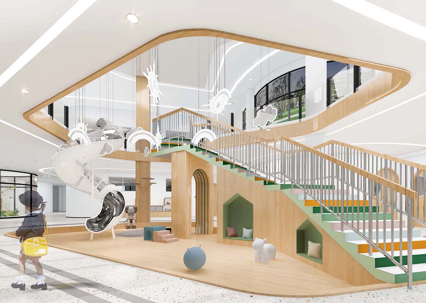 在校园文化设计上,嘉尧设计强调探究趣味、互动体验以及科技感受,将运河幼儿园本身最具亮点的“运河元素”,“光照元素”,“房子元素”融会贯通。结合幼儿教育中循循善诱(运河)、自然向上(光照)、爱的呵护(房子)进行空间营造和功能设计。