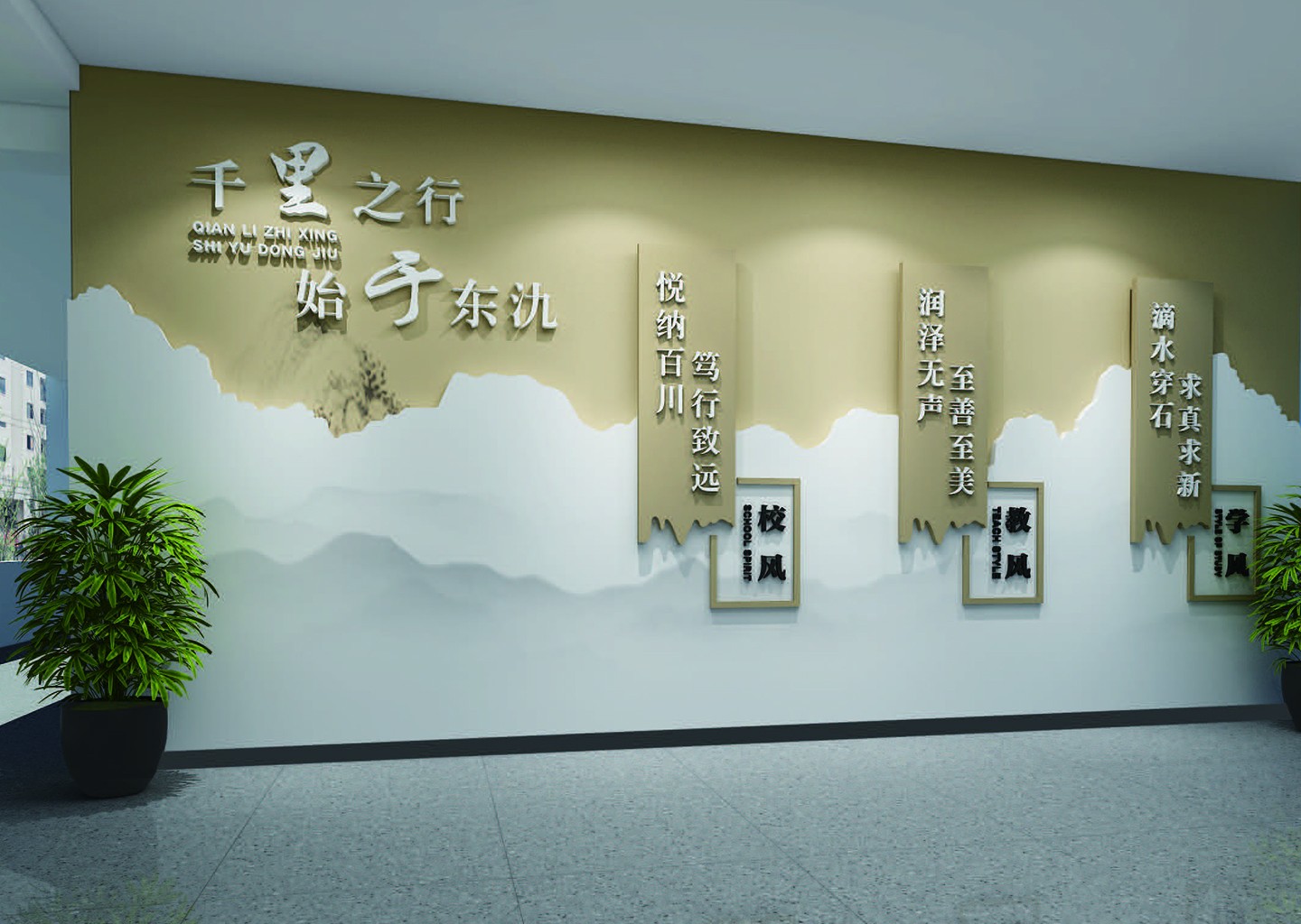 秉承每个人都是独特的生命个体,每个人都有“闪光点”的理念,根据地域文化提炼出“每个人都了不起”的核心价值观。围绕这个核心价值观,遵循“以人为本”的育人理念,紧扣“五育并举”的环境建设思路,将五育文化融入到校园环境景观的设计中。